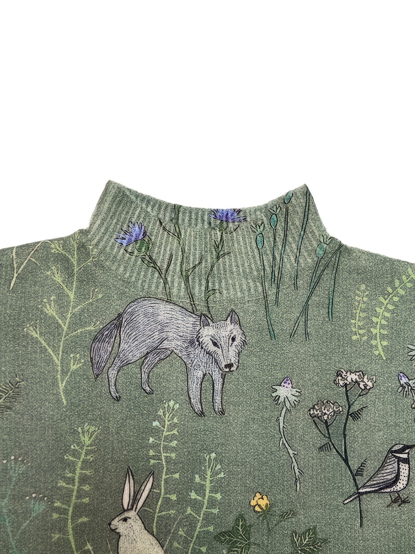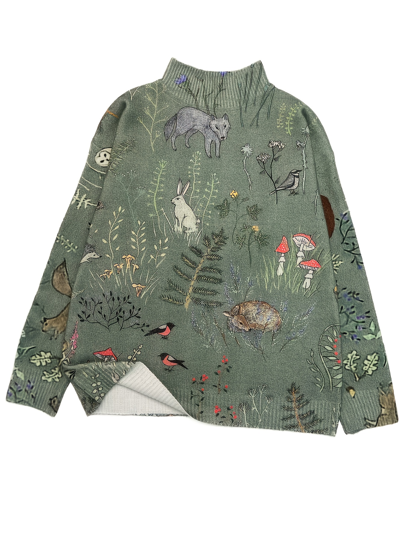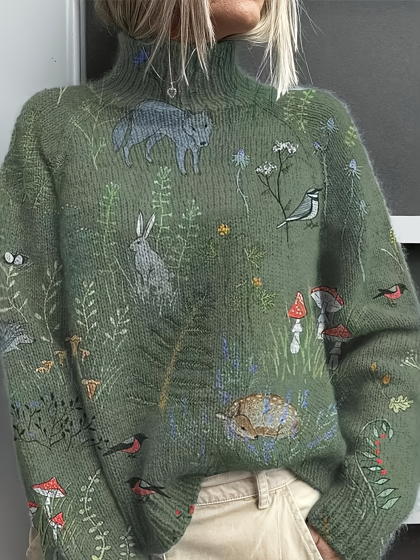 [3D Print Forest Sweater] Women's 3D All-Over Print Forest Sweater - Oversized H-Line Silhouette, High Neck Long Sleeves, Green Pullover with Foxes Rabbits Birds Mushrooms - All-Season Casual Semi-Formal Wear