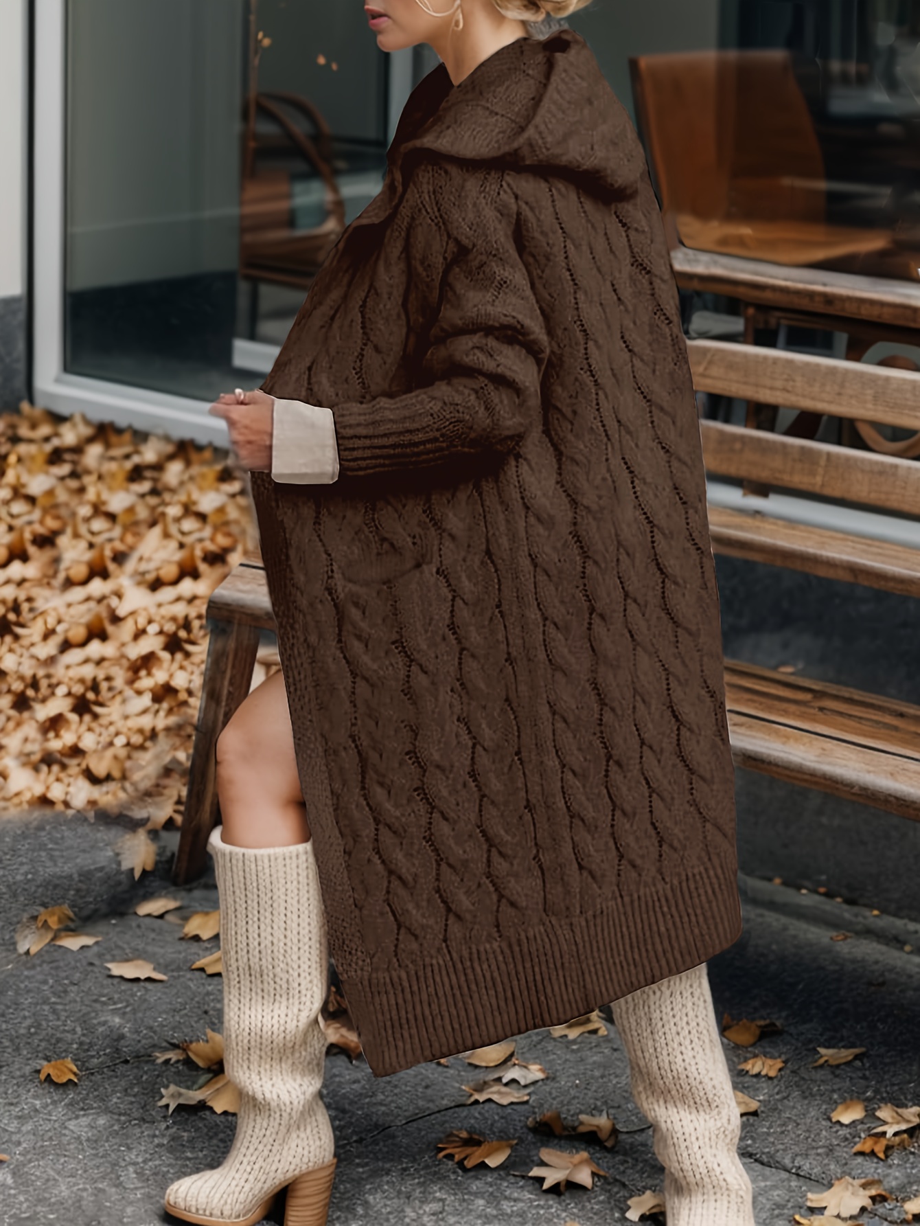 Brown Women's Oversized Hooded Cardigan Sweater with Pockets - Thick Winter Warmth, Mid-Stretch Comfort, Elegant Longline Coat for Fall & Winter, Casual to Semi-Formal Outfits