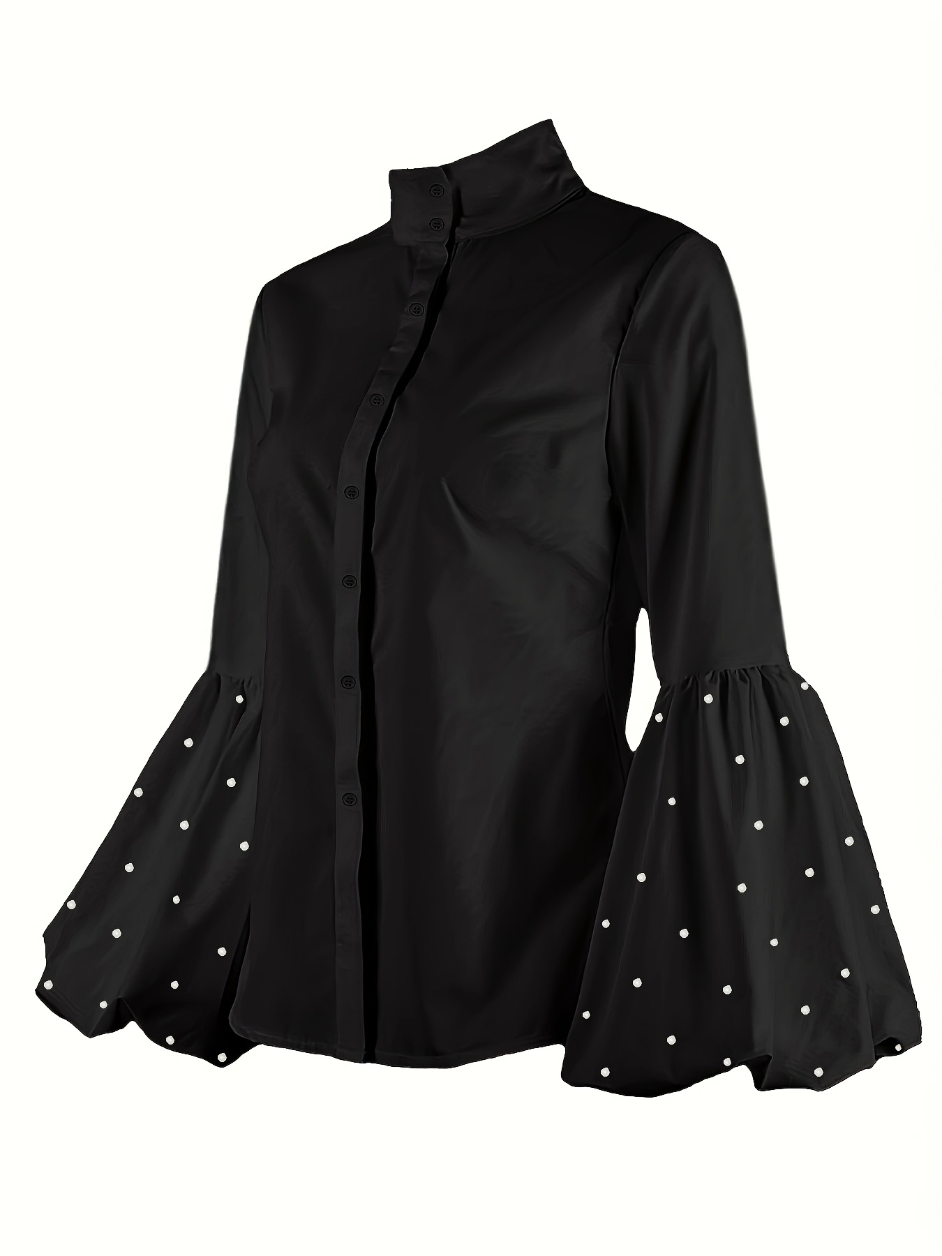 Pearl Detail Chic High Neck Long Sleeve Shirt - Polyester-Spandex Blend, Solid Color, Regular Fit, Woven Fabric, Ideal for Spring/Fall - Women'S Fashion