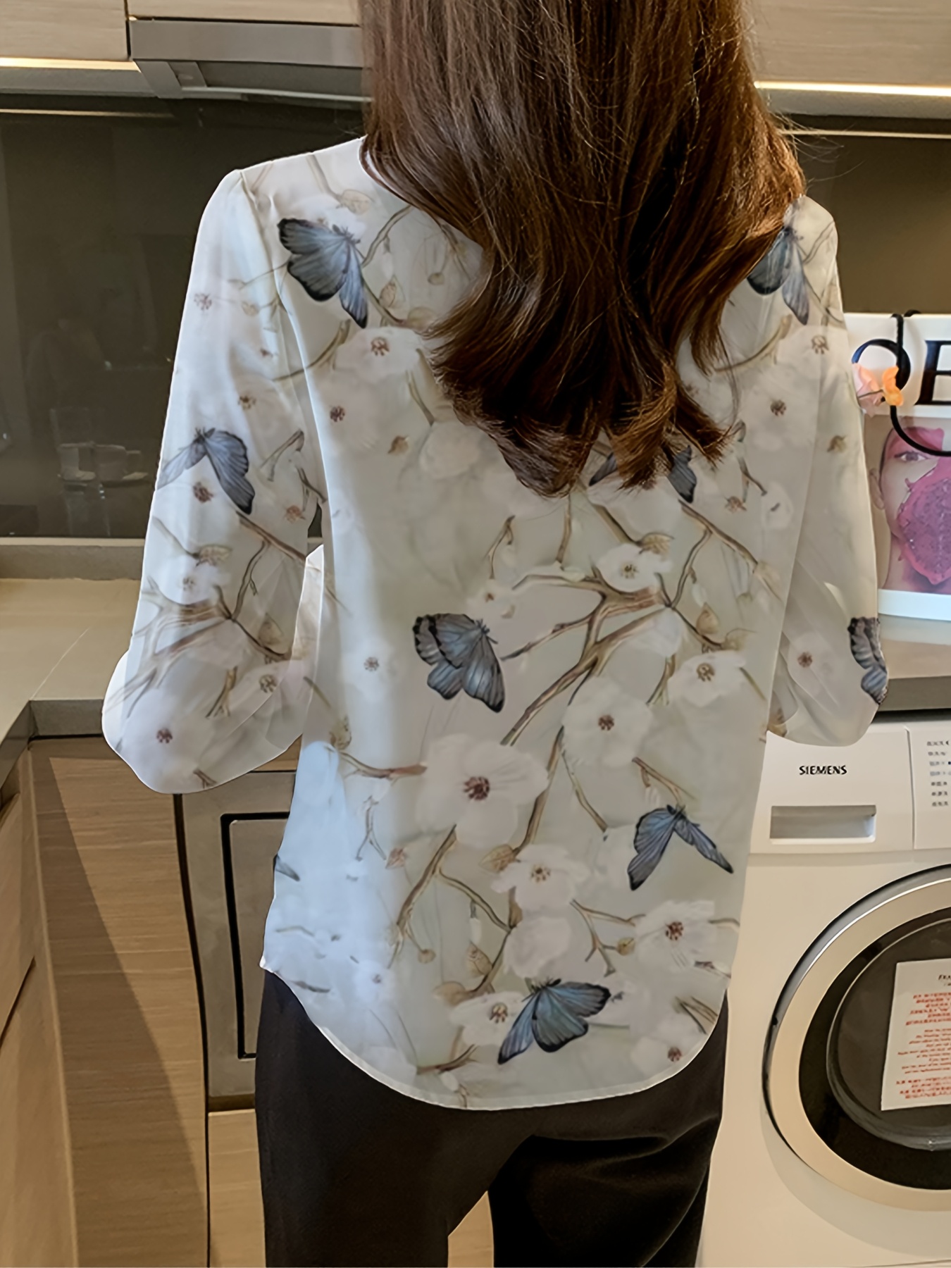 Women'S Elegant Floral and Butterfly Print Long Sleeve Shirt - Casual Turnover Collar, Single-Breasted POLO Style Top for Spring/Fall, Floral Print Blouse