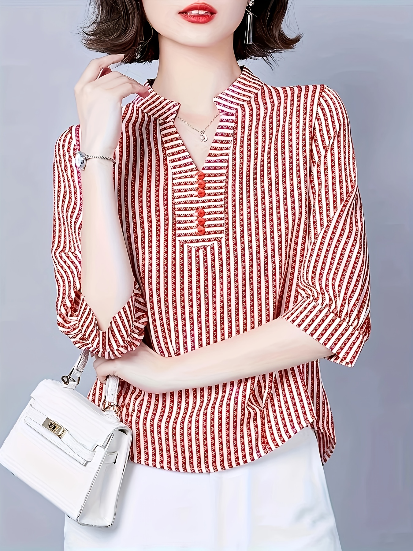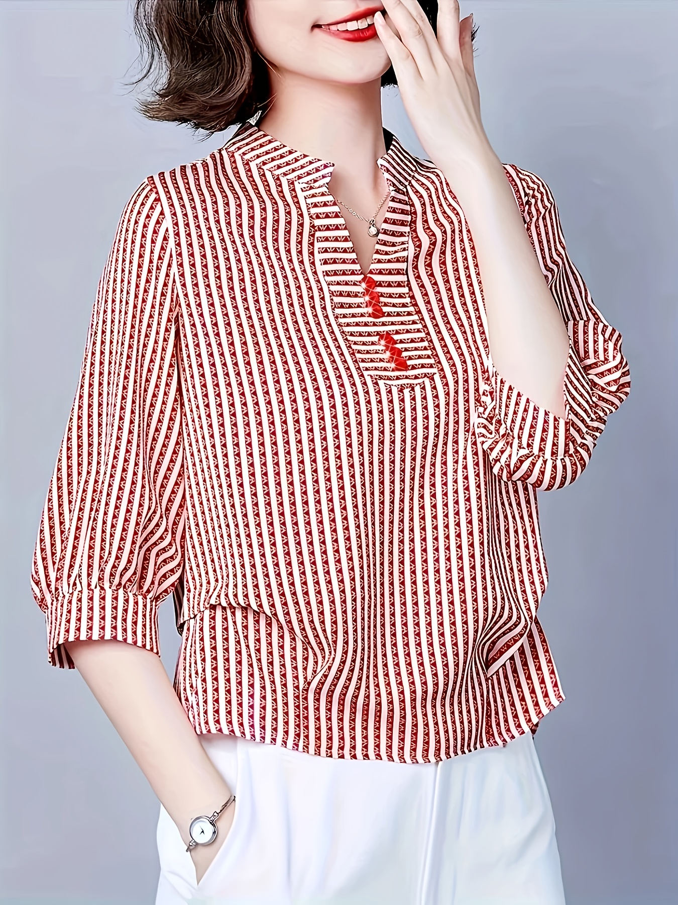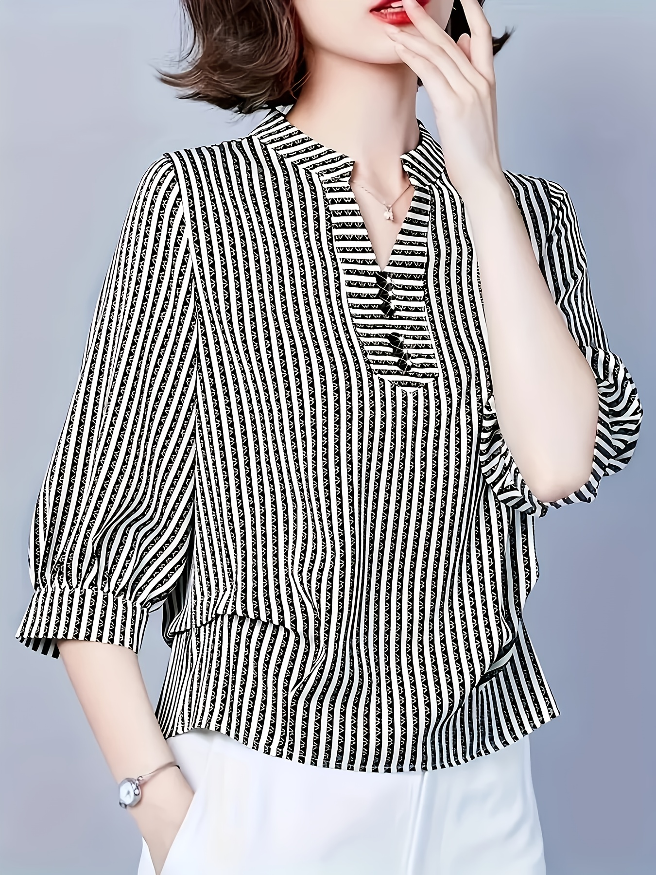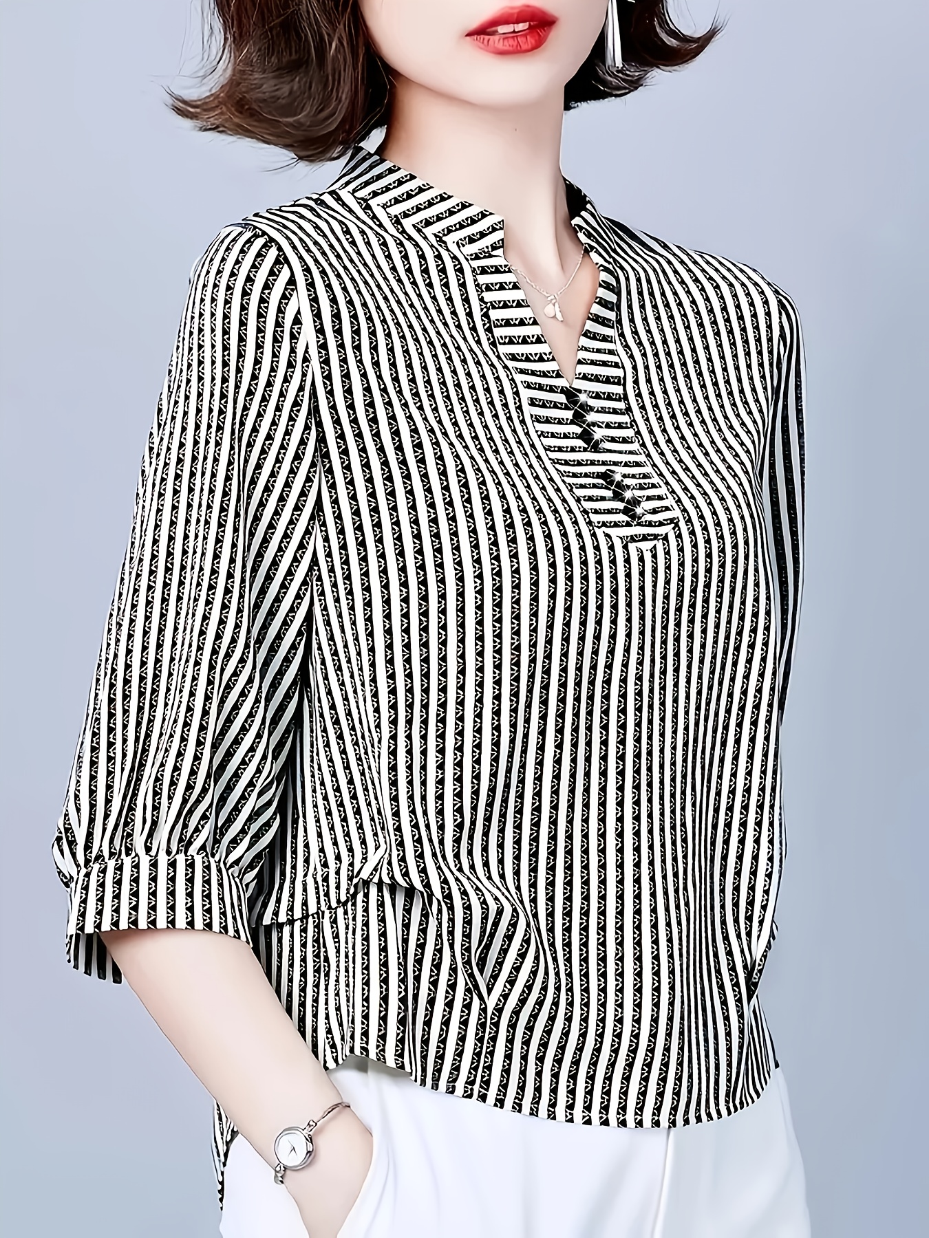 [Breathable Black & White] Elegant Women's Loose V-Neck Shirt With 3/4 Sleeves And An Asymmetrical Hem, Breathable Black And White Stripes For Spring, Summer, And Autumn