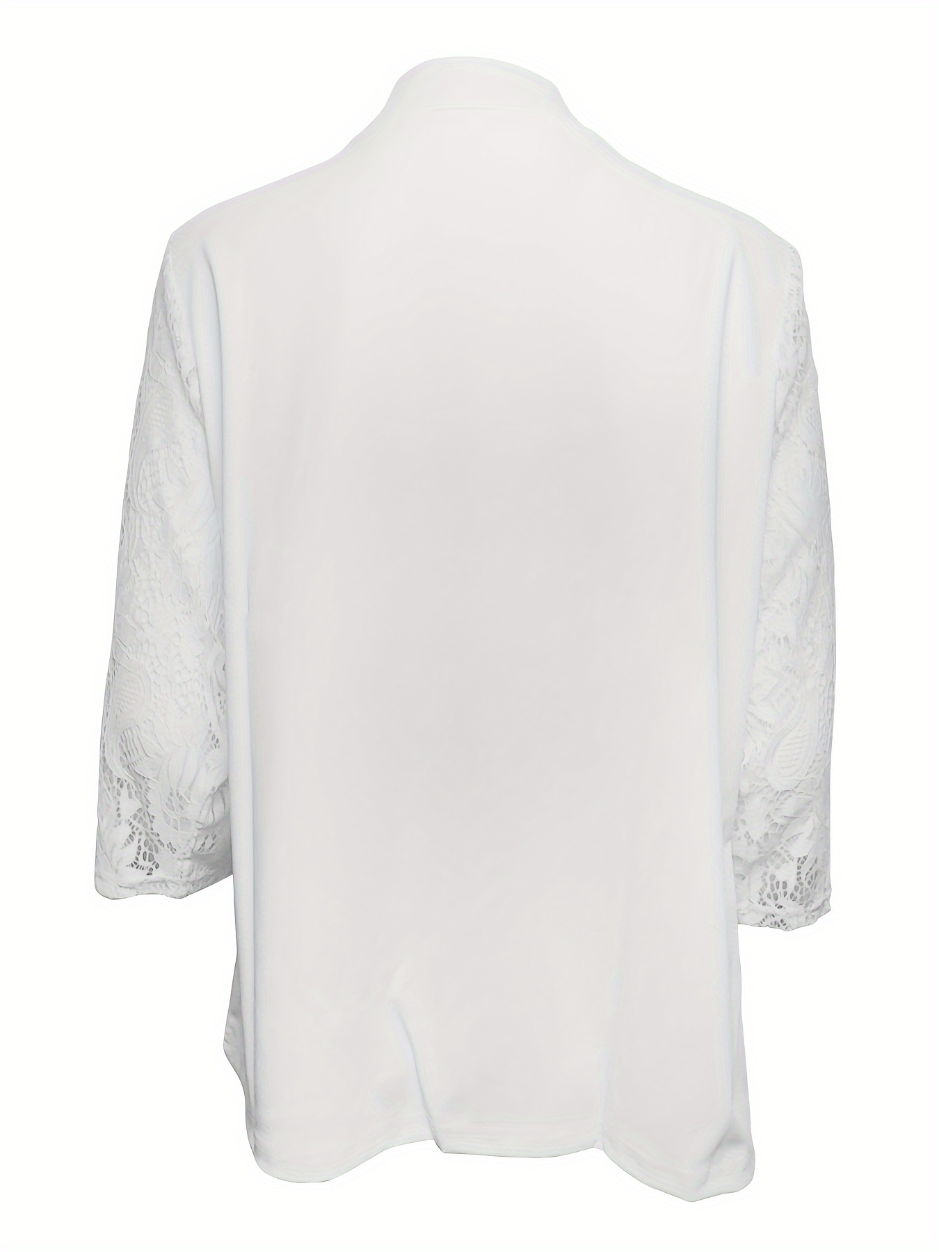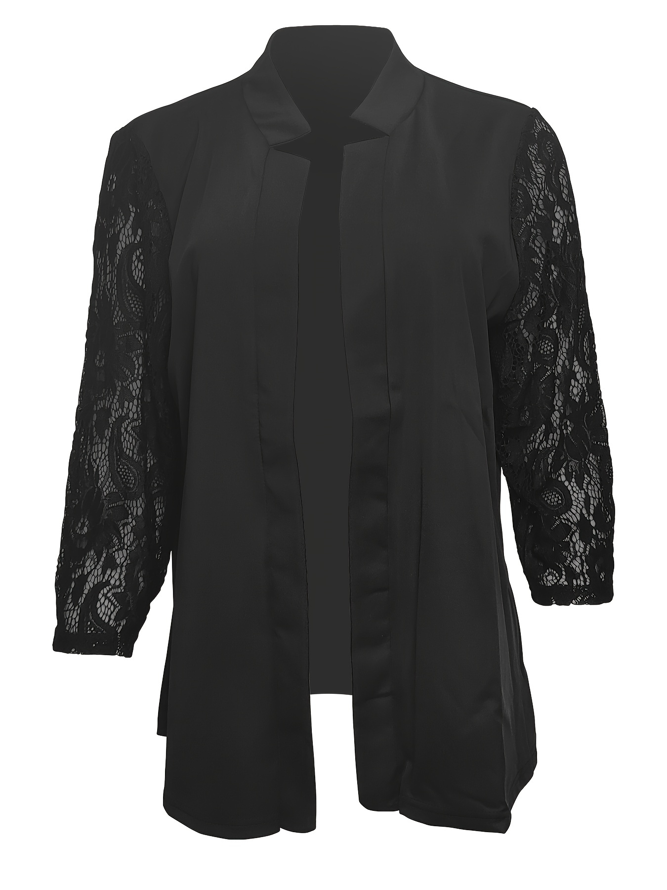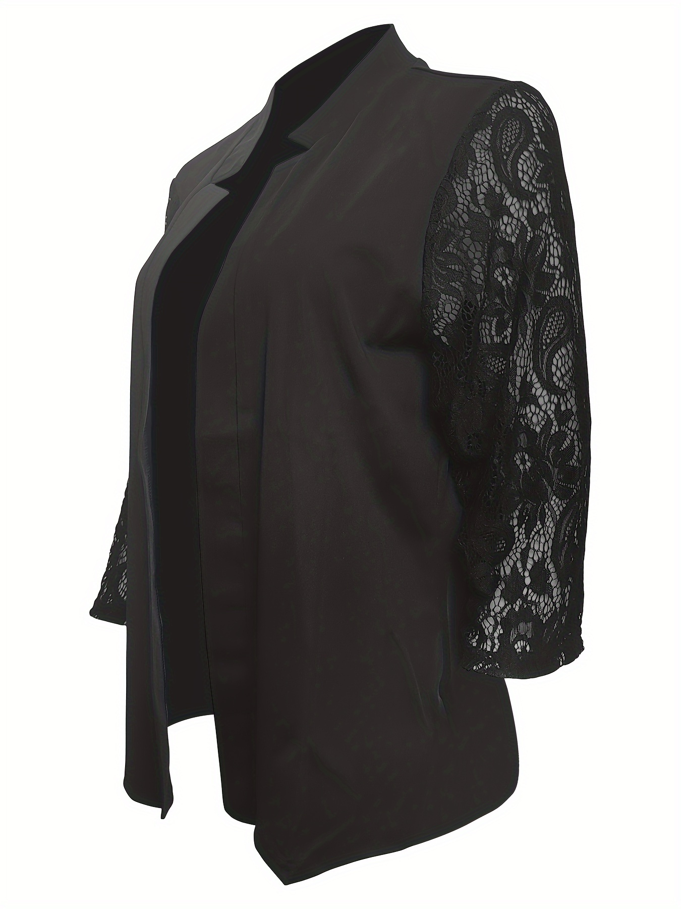 Plus Size - Women'S Elegant Lace Sleeve Blazer - Structured Lapel Collar Tailored Fit Cardigan, Solid Black with Contrast Lace Cuff & Hem, Spring Summer Casual to Semi-Formal Outerwear, Versatile for Everyday & Special Occasions, Lace Blazer for Women Plus Size, Plus Size Lace Blazer for Women Plus Size Coats And Jackets, Formal Lace Blazer for Women, Stretch Blazer For Women