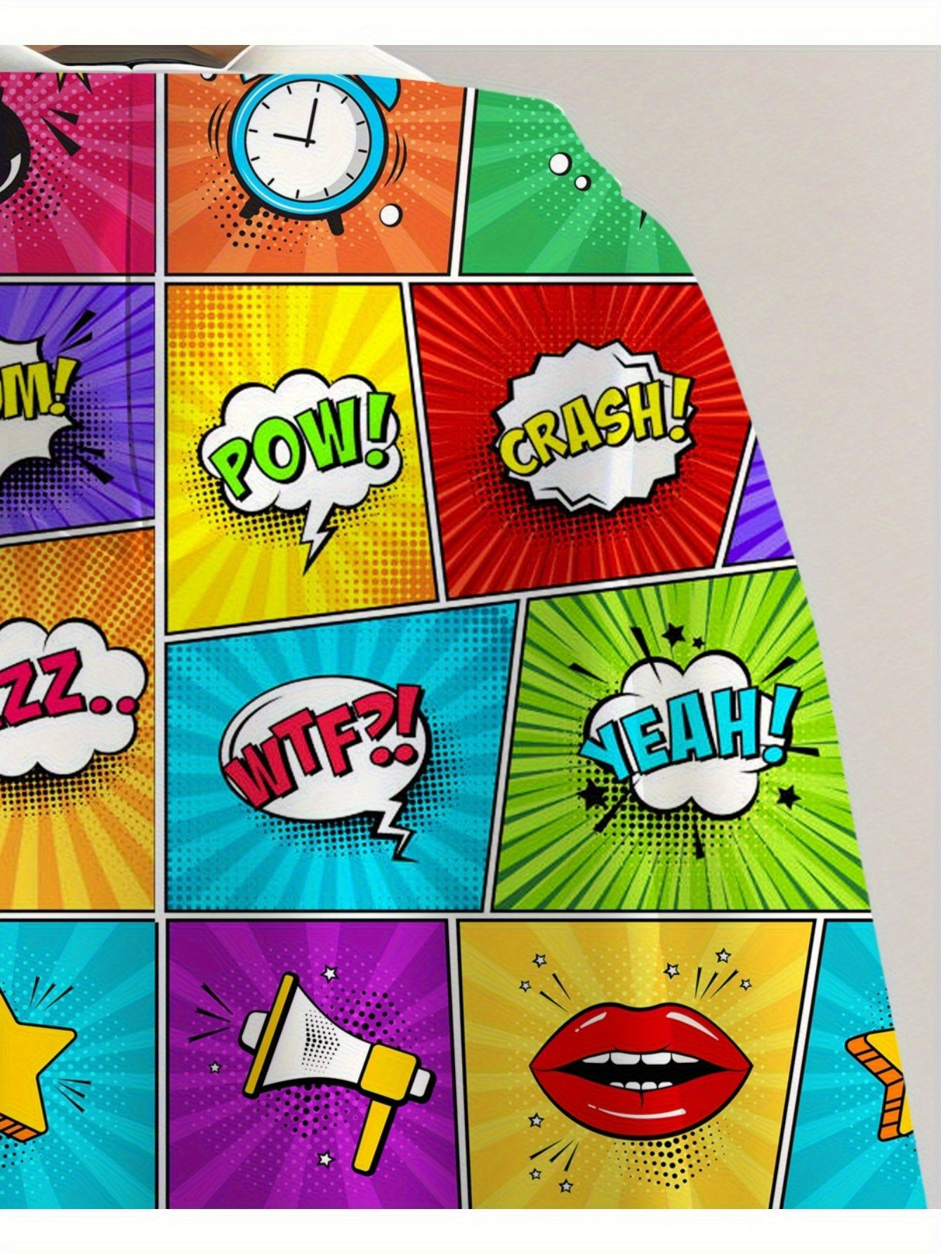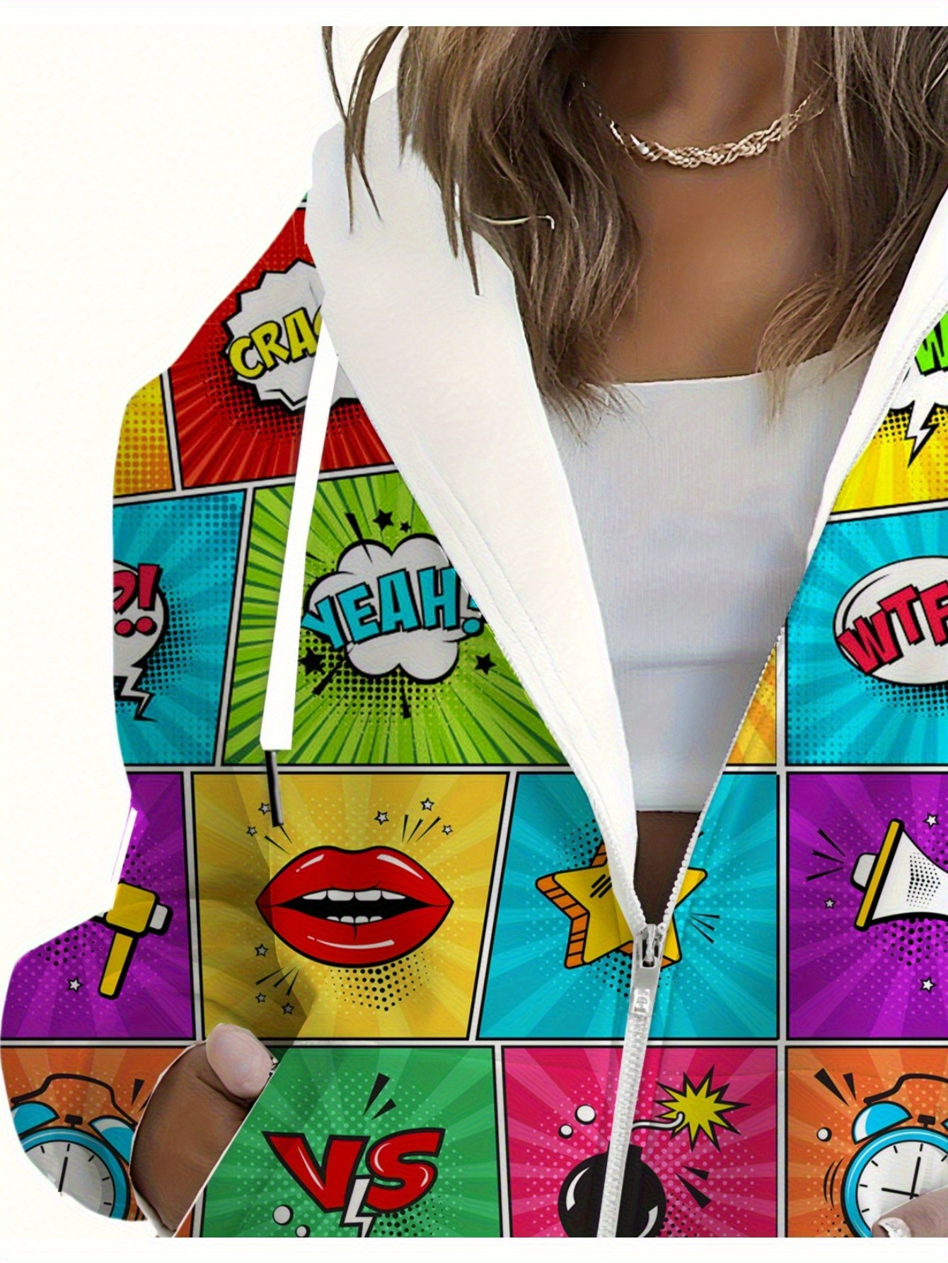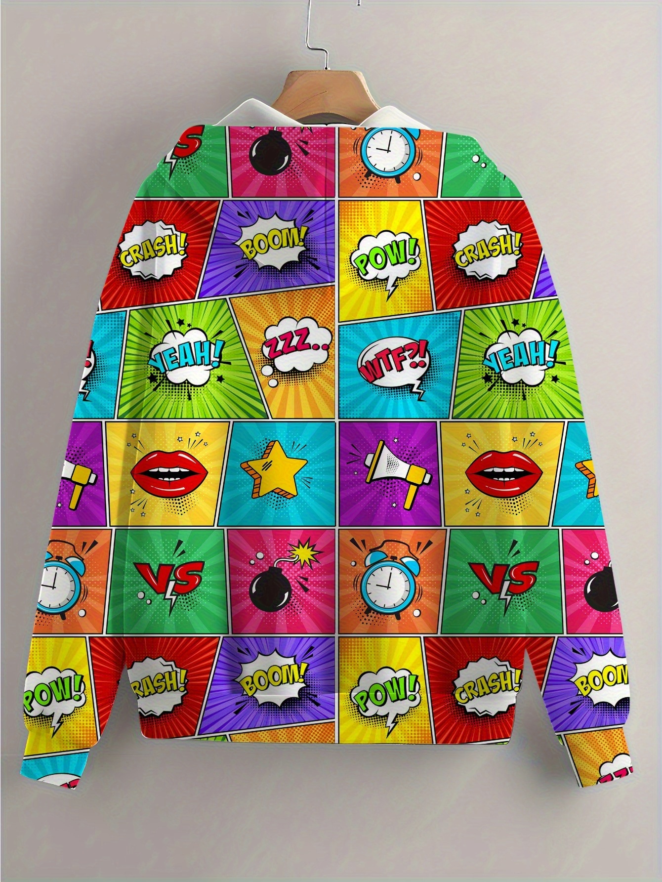 Women's 80s 90s Retro Pop Art Hooded Jacket - Full-Zip H-Line Winter Coat with Lips, Music Notes & Cassette Tapes Print, 3D All-Over Retro Design, Machine Washable Casual Themed Party Outfit (Vibrant 80s/90s Style)