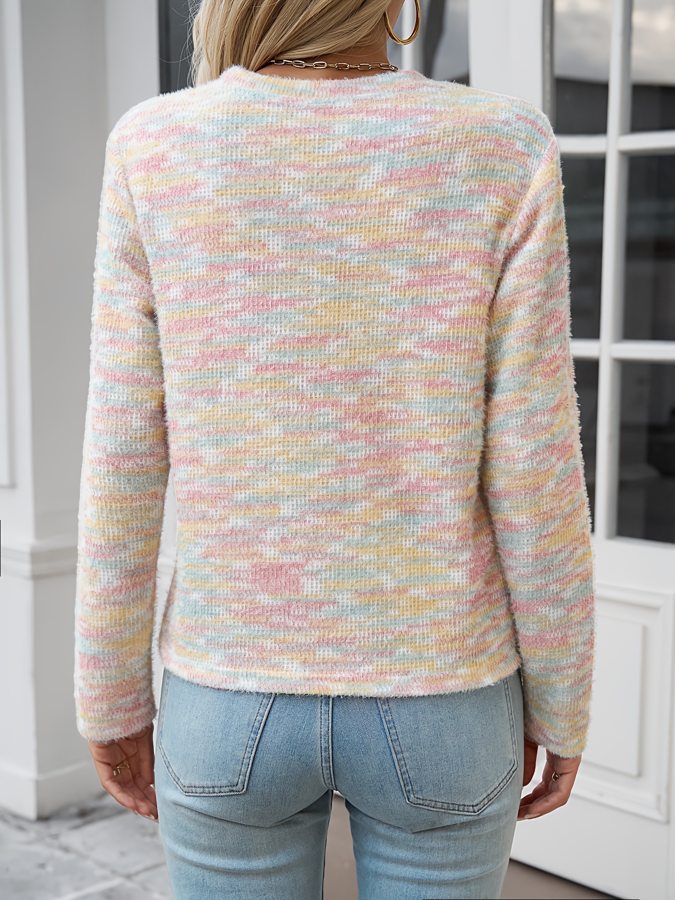 Women's Rainbow Striped Sweater - Pastel Color Block Design, Soft Round Neck Pullover, Hand Washable All-Season Casual Top, Cute Sweaters, Durable Fabric