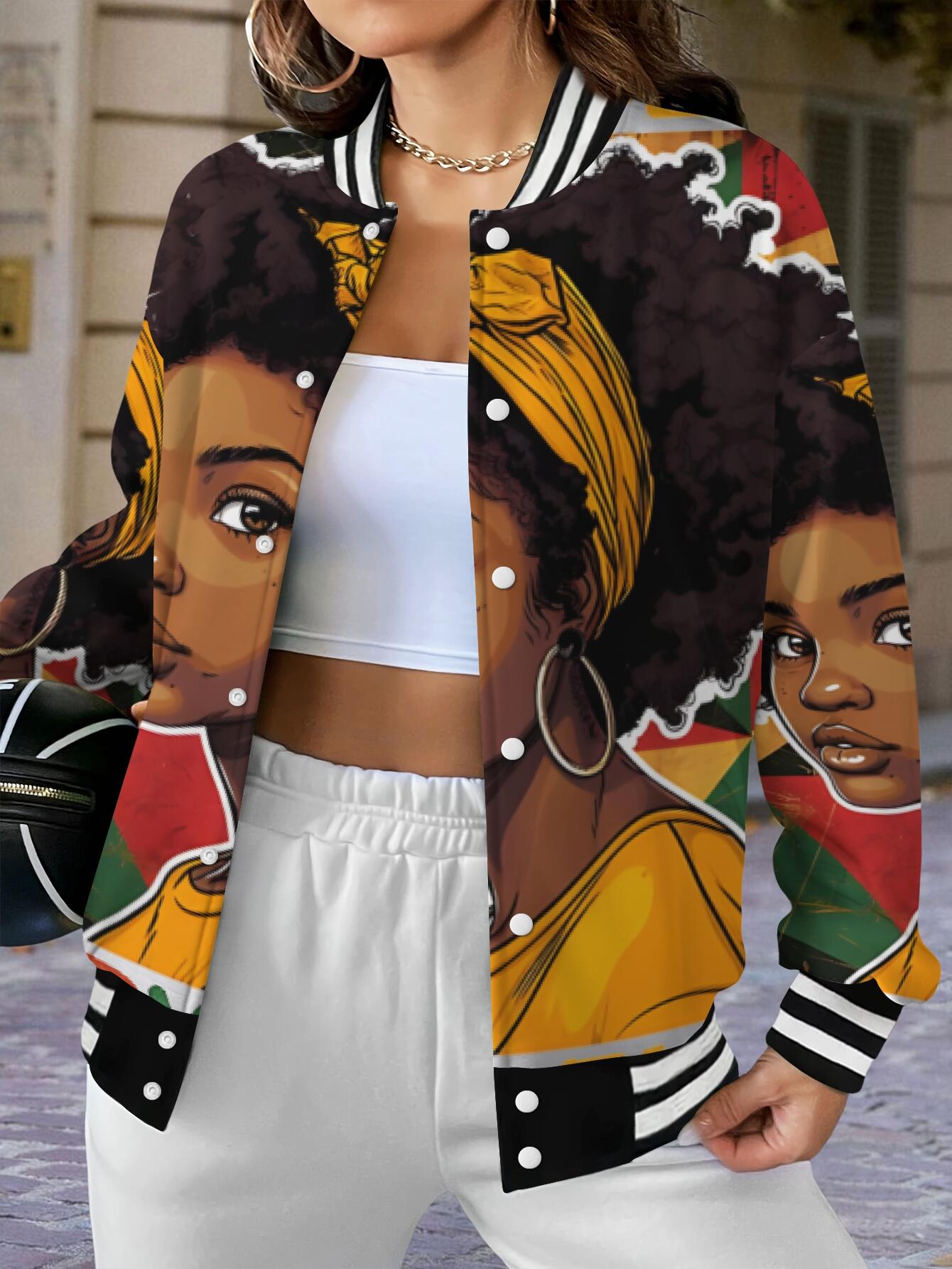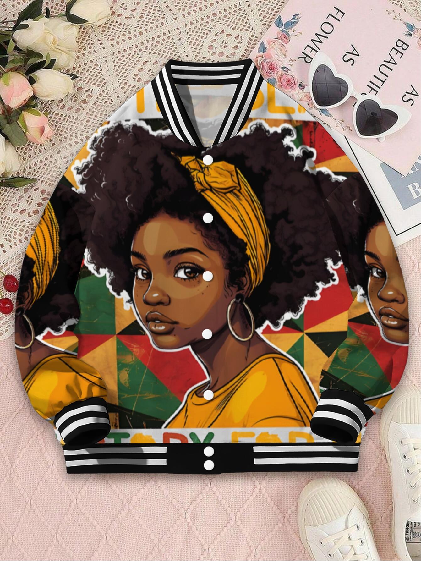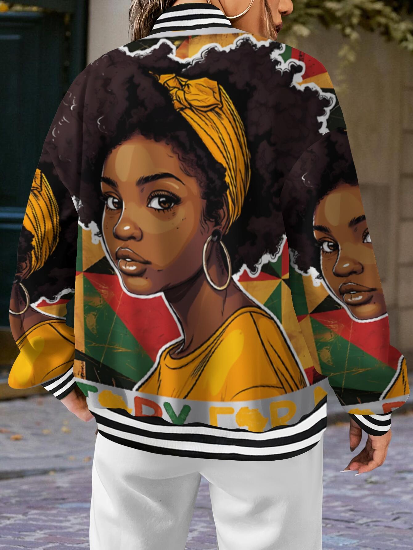 Plus Size Women's African American Pride Melanin Queen Afro Hair & Black History Month Jacket - Varsity Hoodie with Varsity Lettering, Single-Button Closure, Long Sleeve Casual Coat for Fall/Winter, Cultural Celebration Outerwear