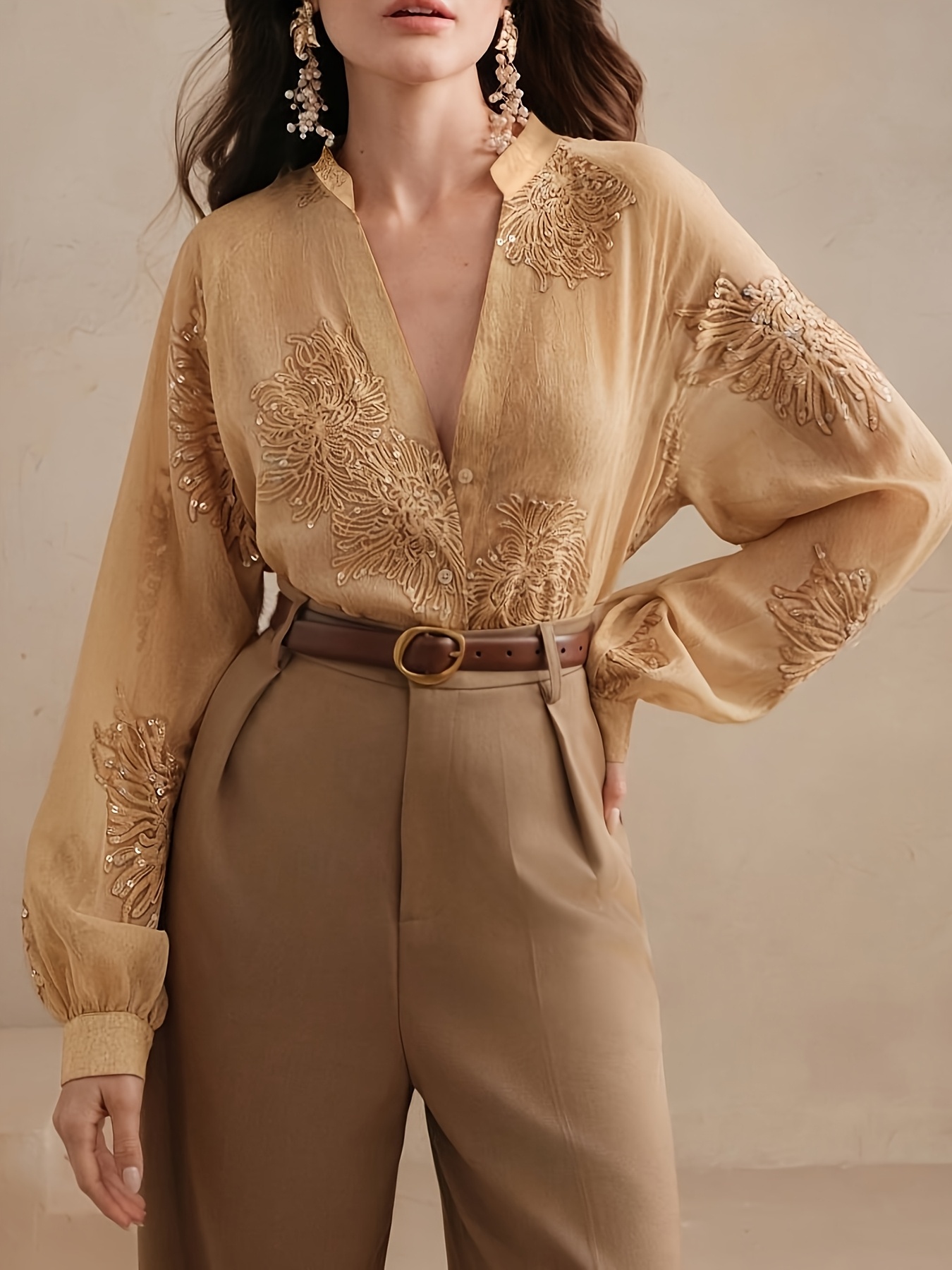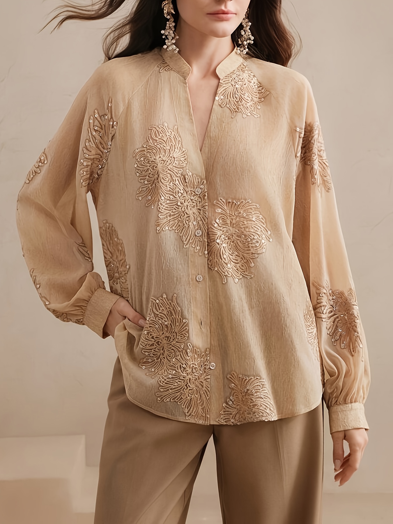 Elegant French Embroidered V-Neck Long Sleeve Blouse for Women - Chic Button-Up Shirt with Floral Pattern, Perfect for Business or Casual Outfits, Spring/Summer/Fall, Ladies Blouses