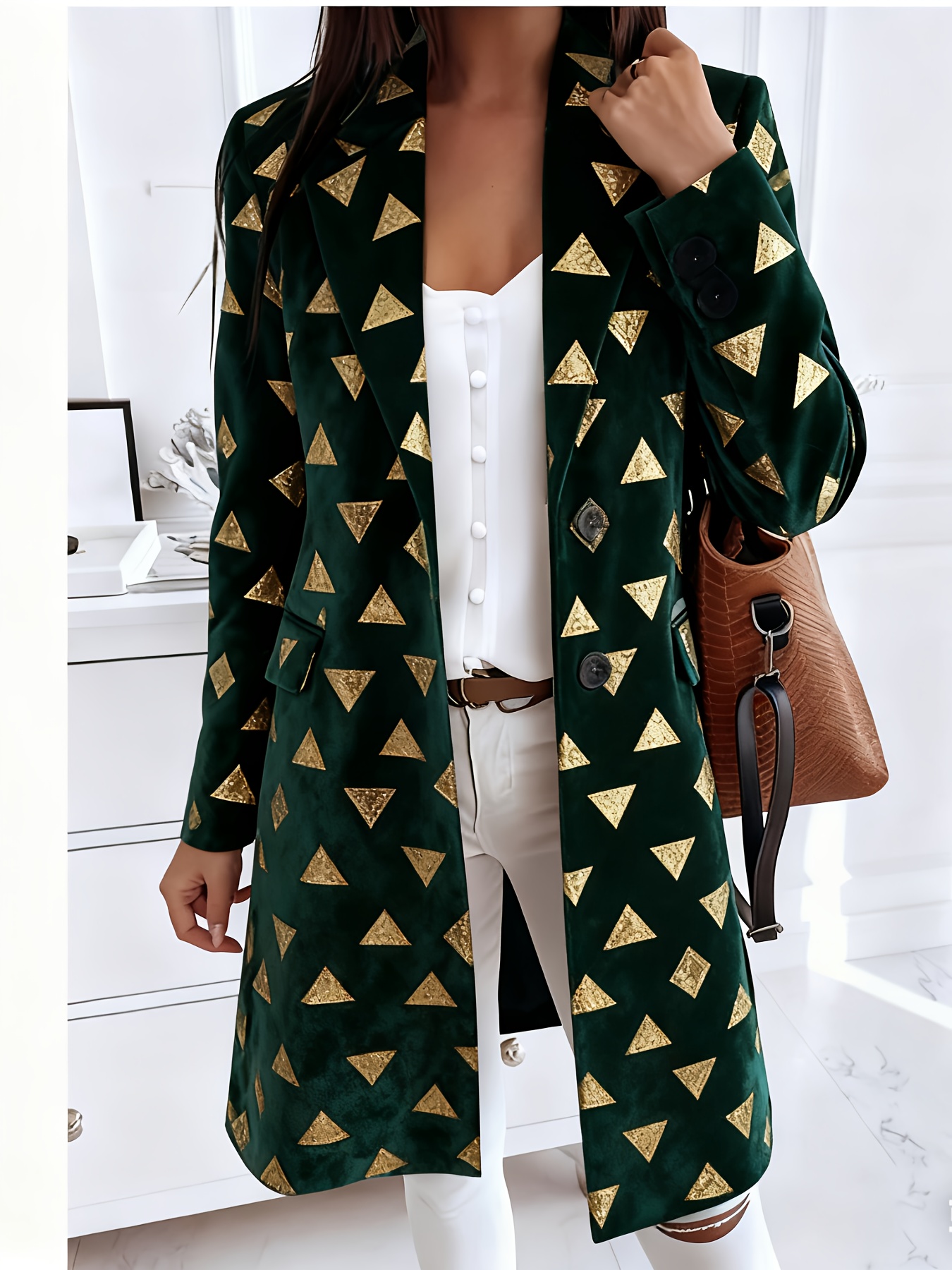 Plus-Size Women's Oversized Collar Button-Front Jacket - Winter-Ready Green & Golden Triangle Print Coat, Machine-Washable Casual to Formal Outerwear with Pockets, Wrinkle-Resistant Layering Piece (No Transparency)