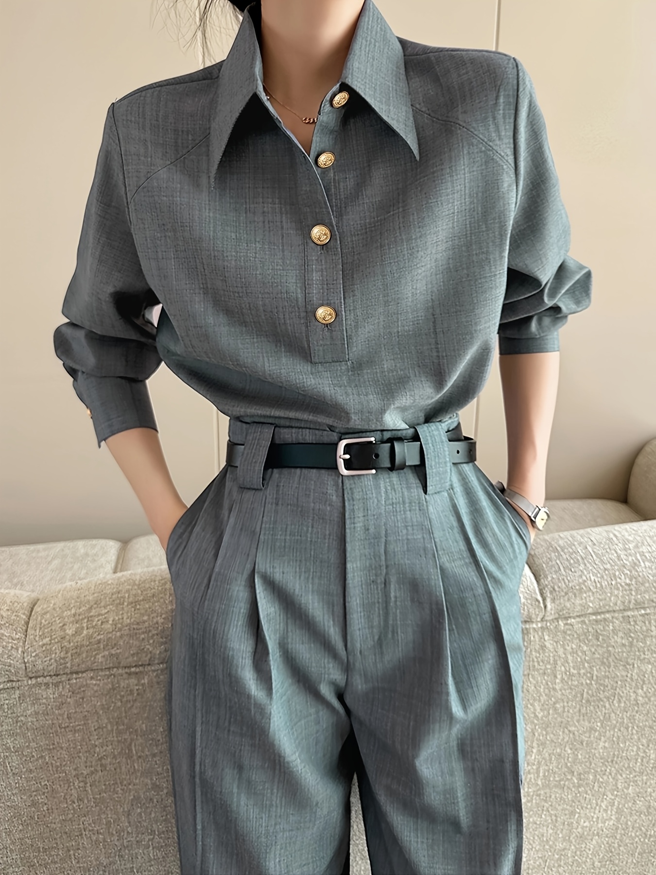[Structured Collar] Structured Collar Blouse Women's | Long Sleeve Wrinkle-Resistant Shirt Jacket-like Top, Solid Grey with Buttons, Tailored Casual & Professional Wear for Office, Semi-Formal Events, Machine Washable Spring/Fall Outerwear