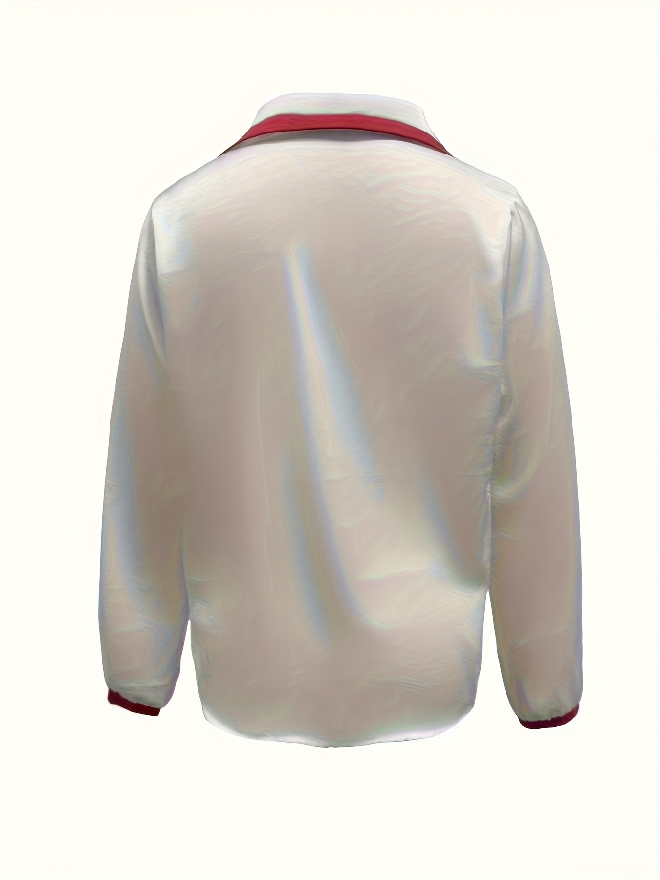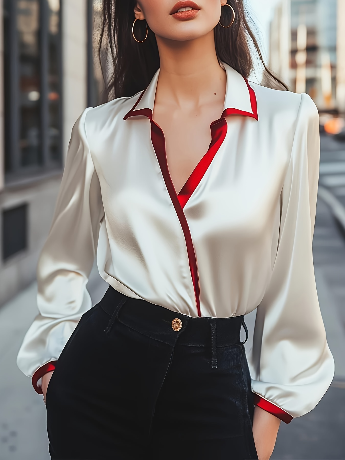 Women'S Elegant V-Neck Blouse with Red Trim - Long Sleeve, Button-Up Shirt in White & Red, Perfect for Spring/Fall, Stylish Office or Casual Wear, Ladies Blouses, White Satin Blouse For Women Elegant