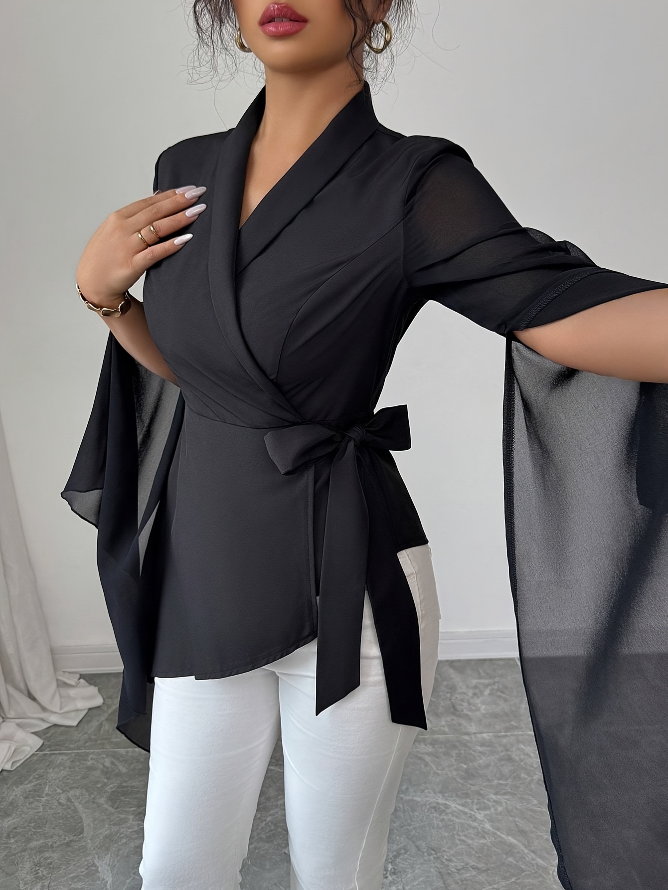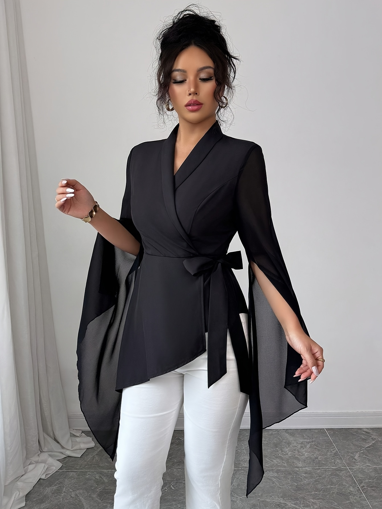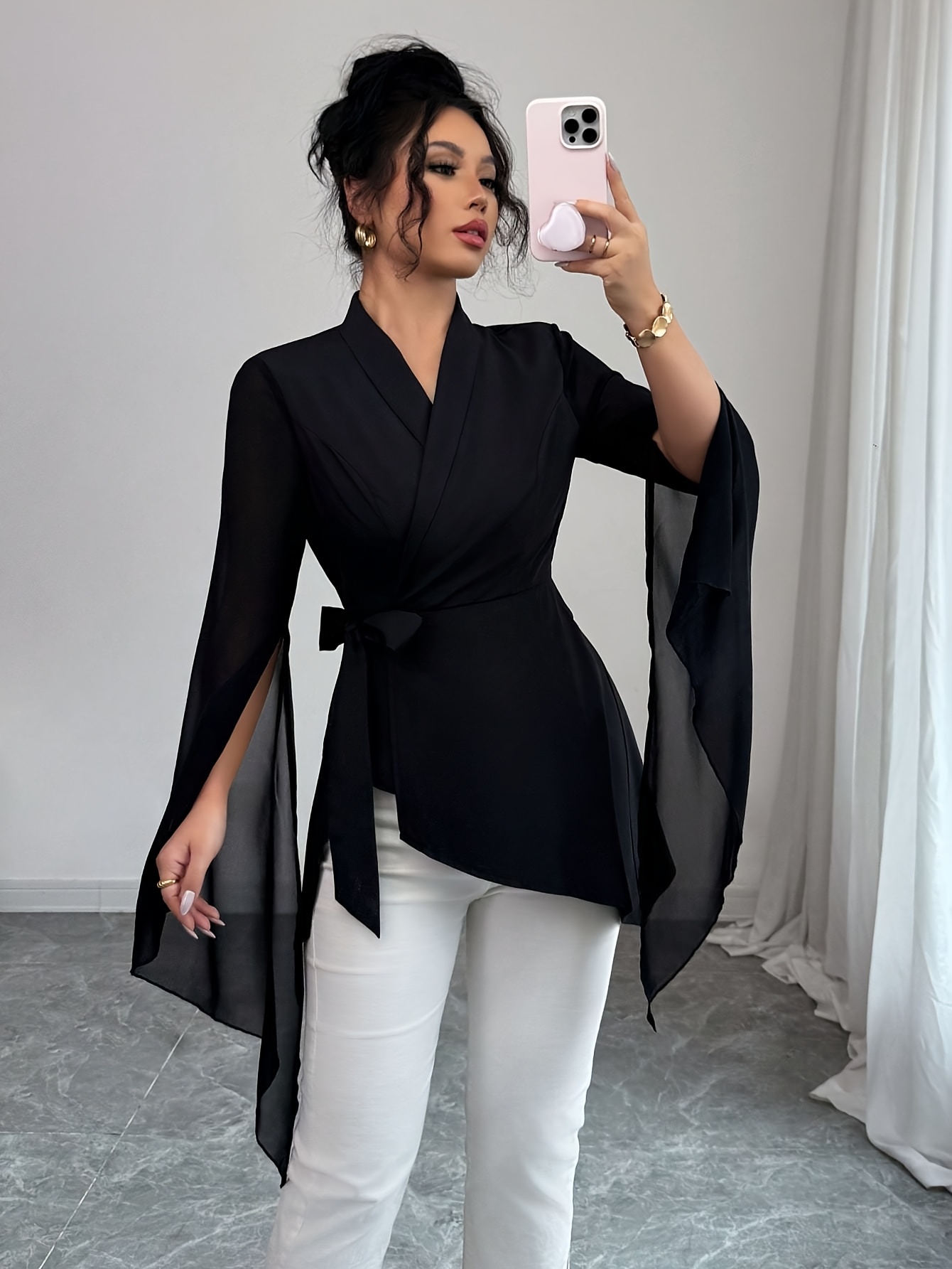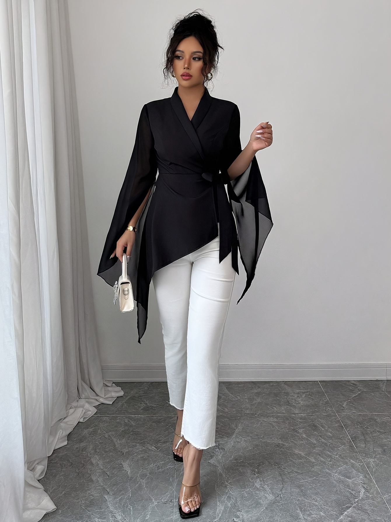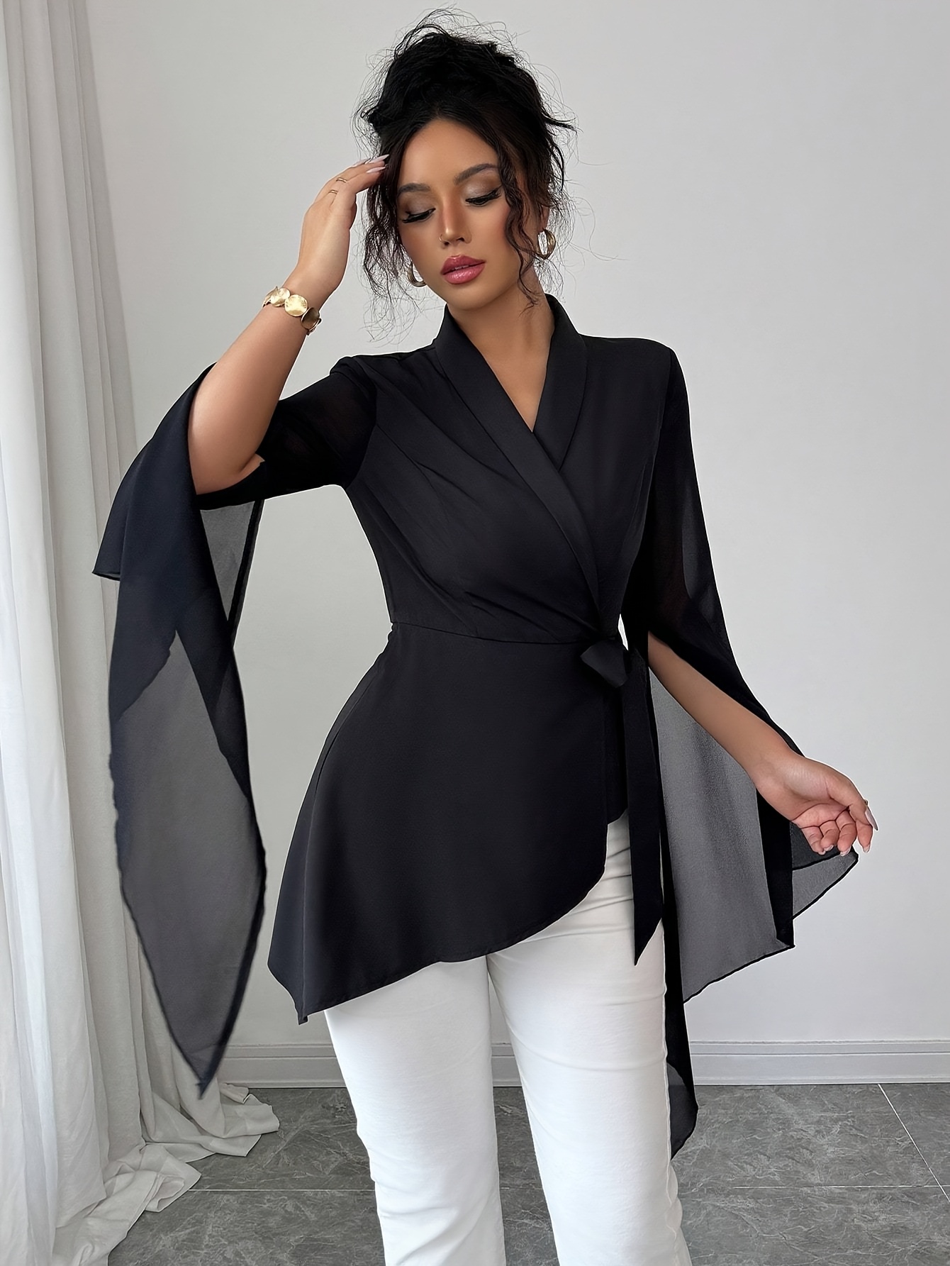 Women's French-Style Asymmetric Blouse - Chiffon Semi-Sheer Shirt Jacket with Short Sleeve, Machine Washable Elegant Tops for Spring/Fall Layering (Solid Color) - Wardrobe Essential for Dresses & Jeans