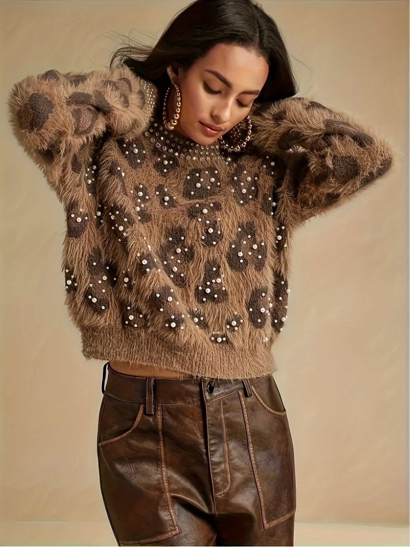 Elegant Leopard Print Pearl-Adorned Sweater Jacket - Luxurious Pearl-Accented Collar & Sleeve Trim, High Elasticity Round Neck Blazer for All-Season Wear, Semi-Sheer Warm Coat (Hand Wash/Dry Clean) - Pearl-Decorated Blazer