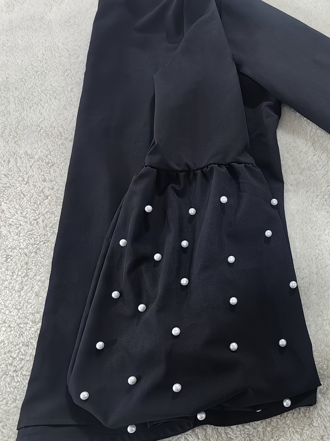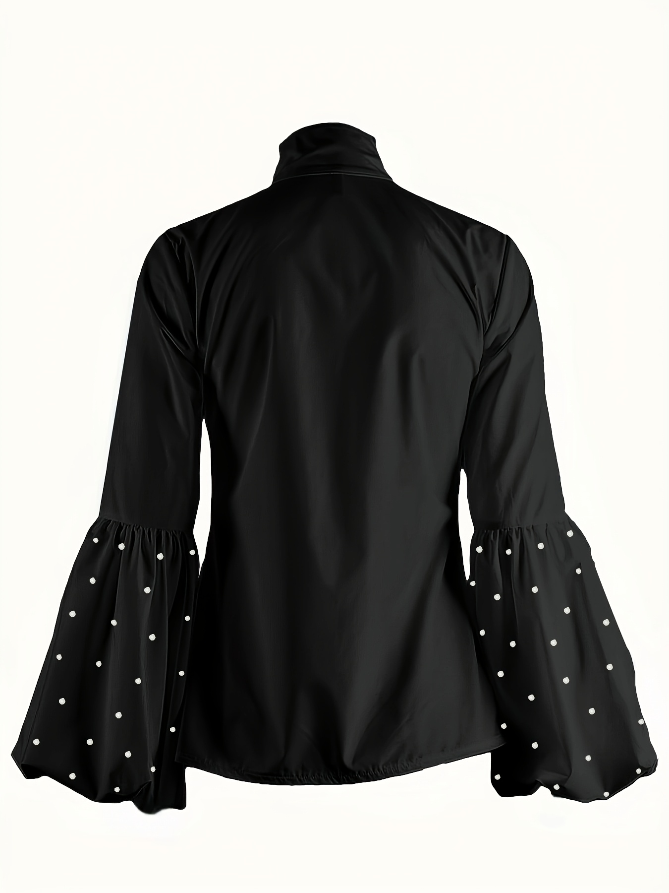 Pearl Detail Chic High Neck Long Sleeve Shirt - Polyester-Spandex Blend, Solid Color, Regular Fit, Woven Fabric, Ideal for Spring/Fall - Women'S Fashion