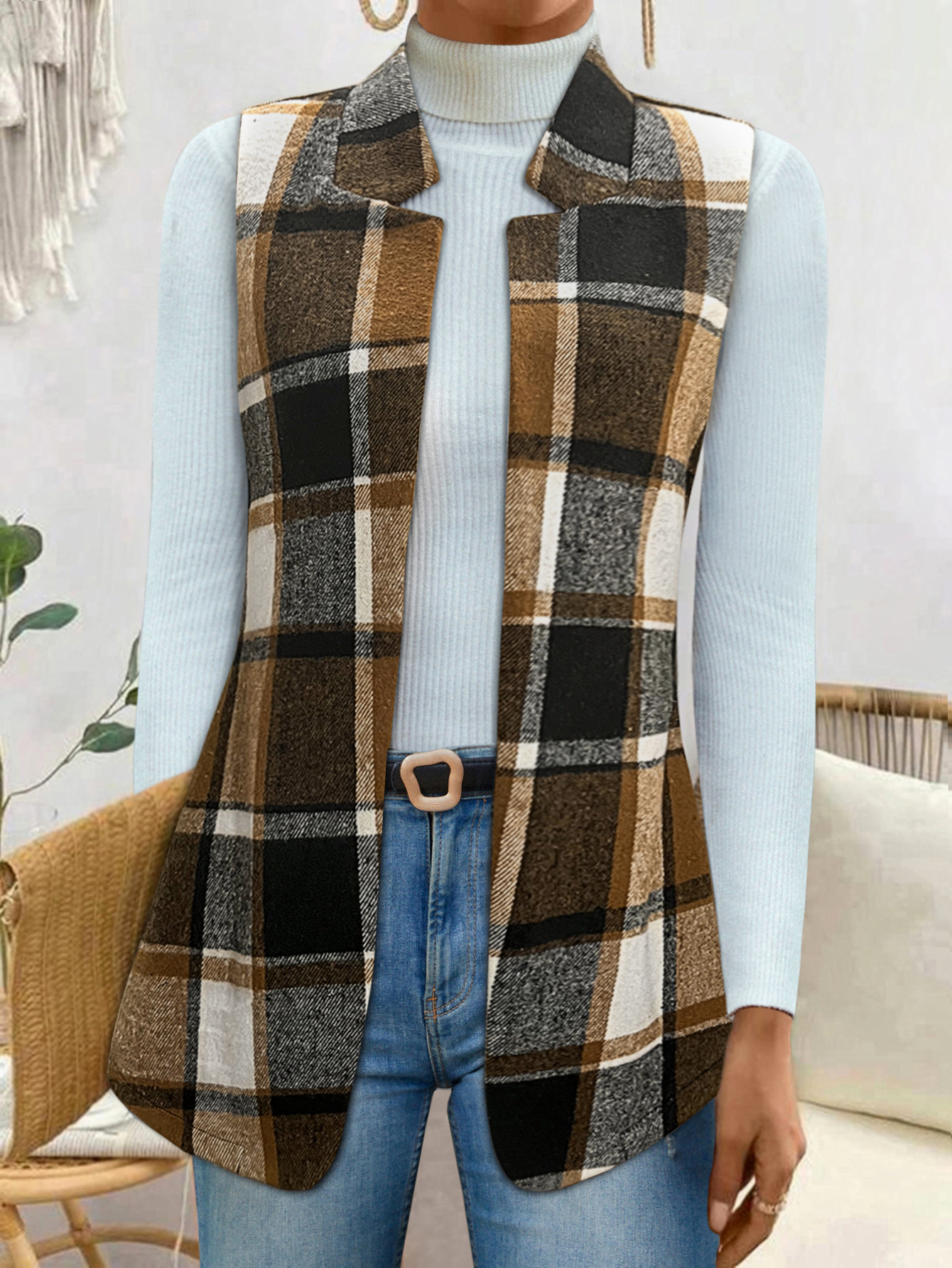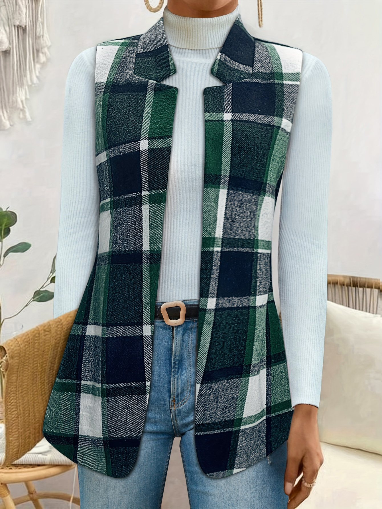 Plus Size - Plus Size, Women'S Plus Size Sleeveless Stand Collar Blazer - Elegant Plaid Print (Green/Black/White) H-Line Silhouette, Structured Lapel Collar & Open Front Closure, Long Length for Office Commute & Casual Outfits, Autumn Winter Outerwear, Versatile Tailored Fit, Workwear Essential, Highquality Stitching, Quality Tailoring