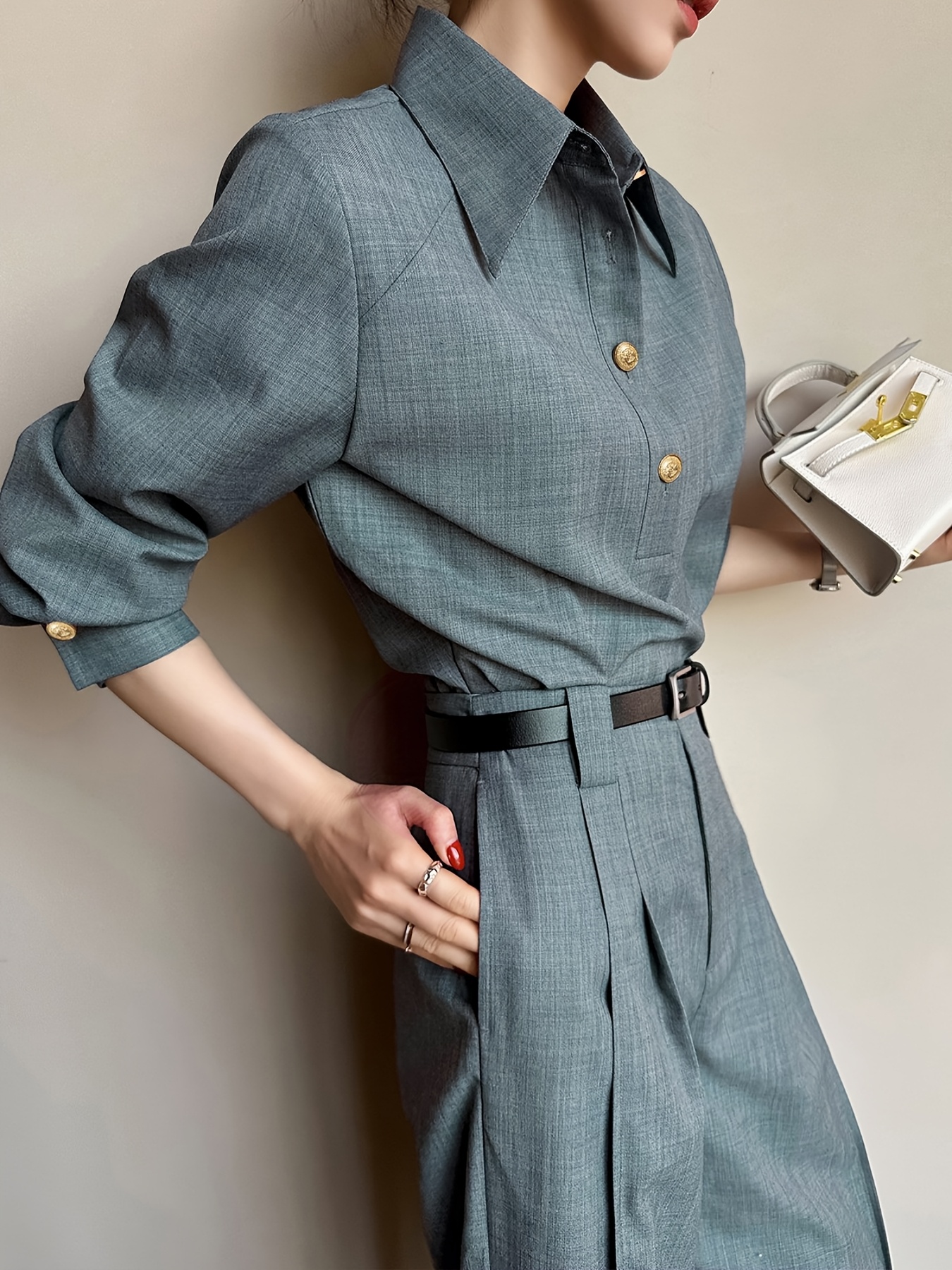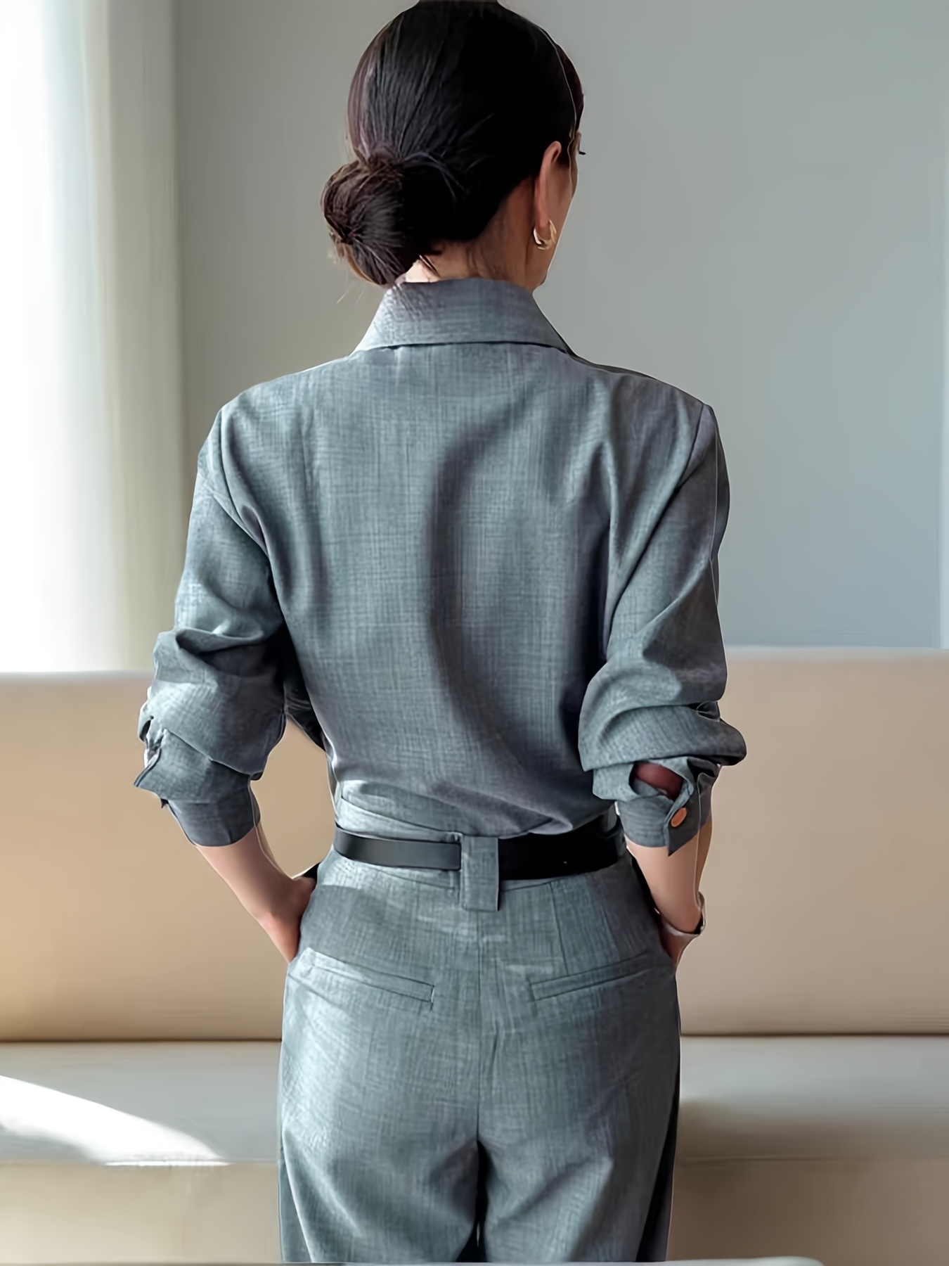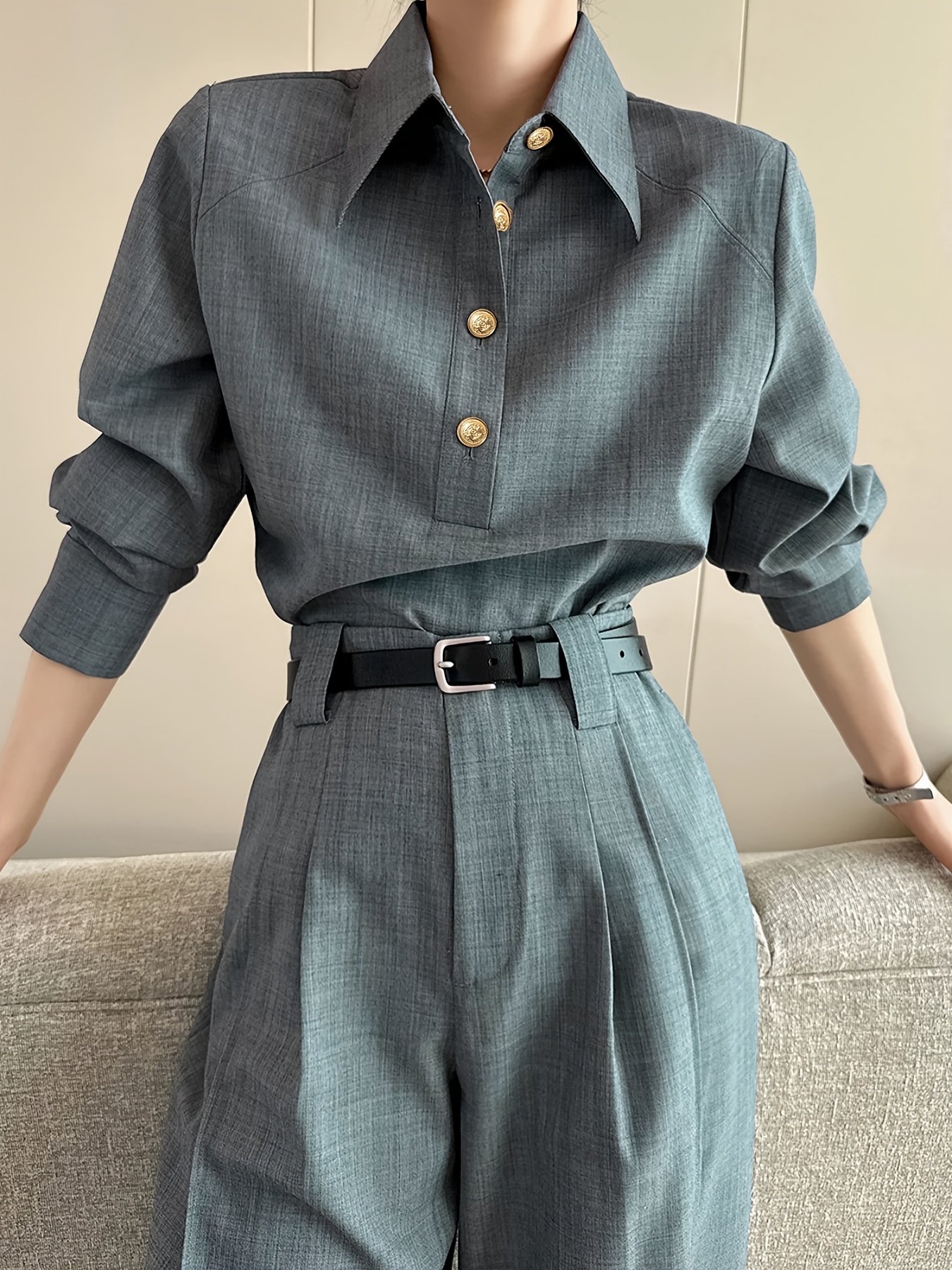 [Structured Collar] Structured Collar Blouse Women's | Long Sleeve Wrinkle-Resistant Shirt Jacket-like Top, Solid Grey with Buttons, Tailored Casual & Professional Wear for Office, Semi-Formal Events, Machine Washable Spring/Fall Outerwear