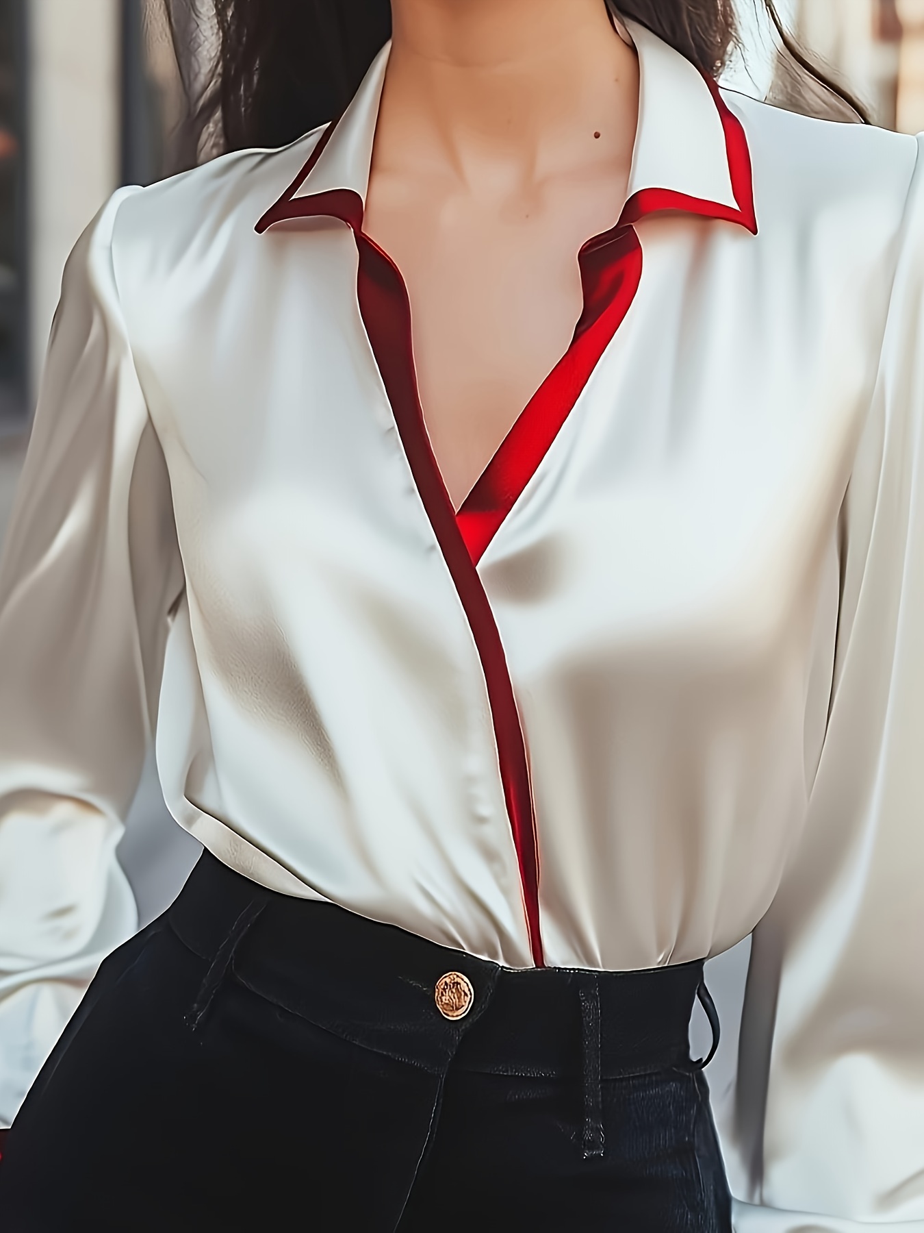 Women'S Elegant V-Neck Blouse with Red Trim - Long Sleeve, Button-Up Shirt in White & Red, Perfect for Spring/Fall, Stylish Office or Casual Wear, Ladies Blouses, White Satin Blouse For Women Elegant