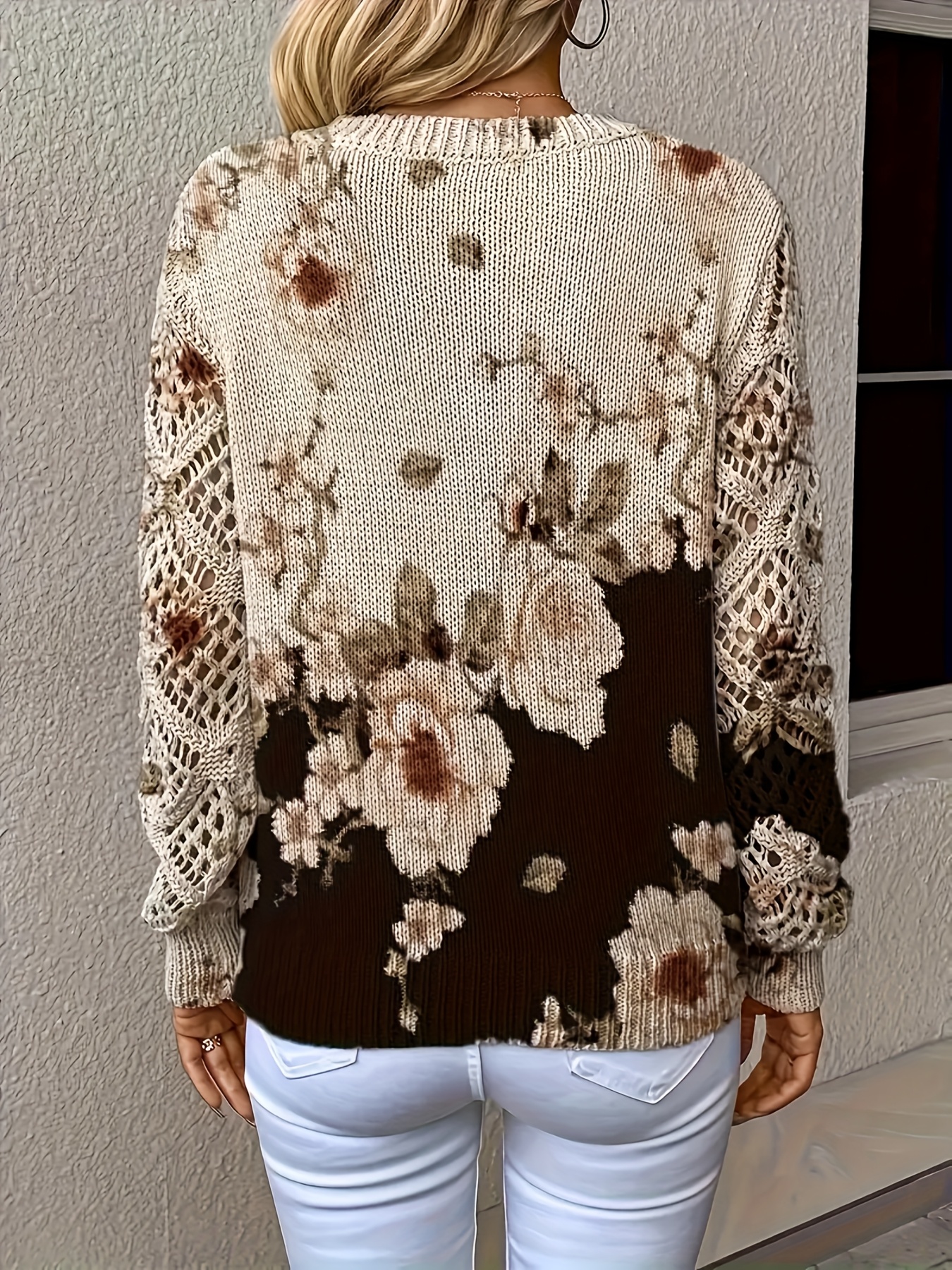 Women'S Elegant V-Neck Long Sleeve Sweater - Floral Print Pullover with BrownRed/Orange/ - Non-Stretchy Sweater for Fall/Winter, Office, Party, Everyday Outfits - Women'S Sweater, Ladies Sweaters, Party Attire, Vneck Design, Durable Knitwear